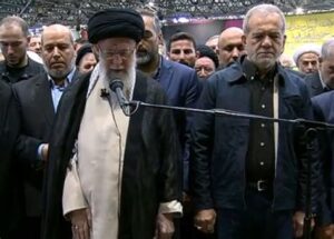 Khamenei, ucciso il 27 febbraio, e il presidente dell’Iran Pedaskhian ai funerali di leader di Hamas di Haninieh